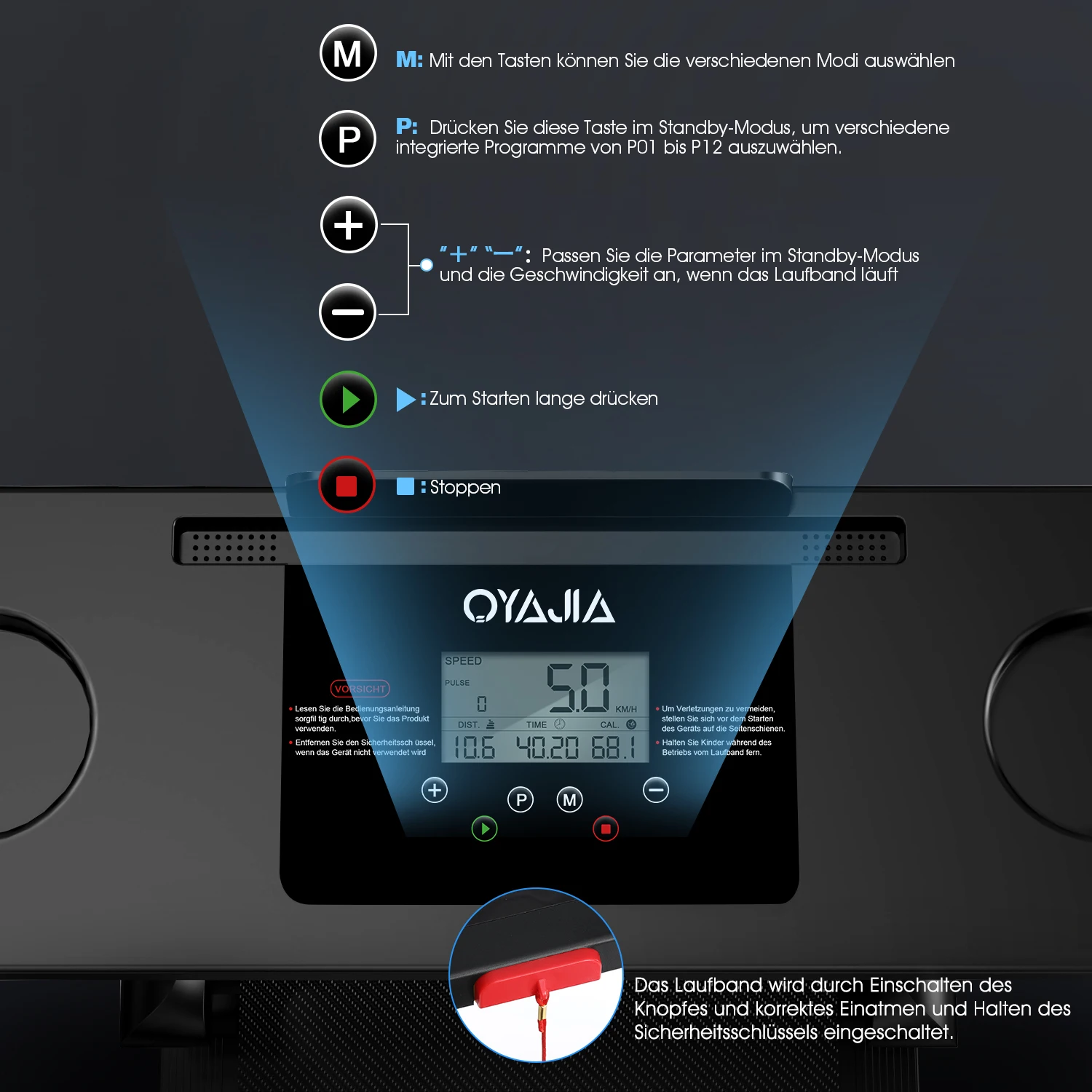 【LED Display Console】 The multi-function LED screen of treadmills with handle bar clearly displays time, speed, distance and calories to accurately track your sports performance.foldable treadmill home have P button 12 preset programs provide different intensity of exercise so that you can see your exercise at a glance and achieve different training goals.In addition, it is also equipped with a cup holder, tablet/mobile phone holder, safety key, and armrests to facilitate your exercise.